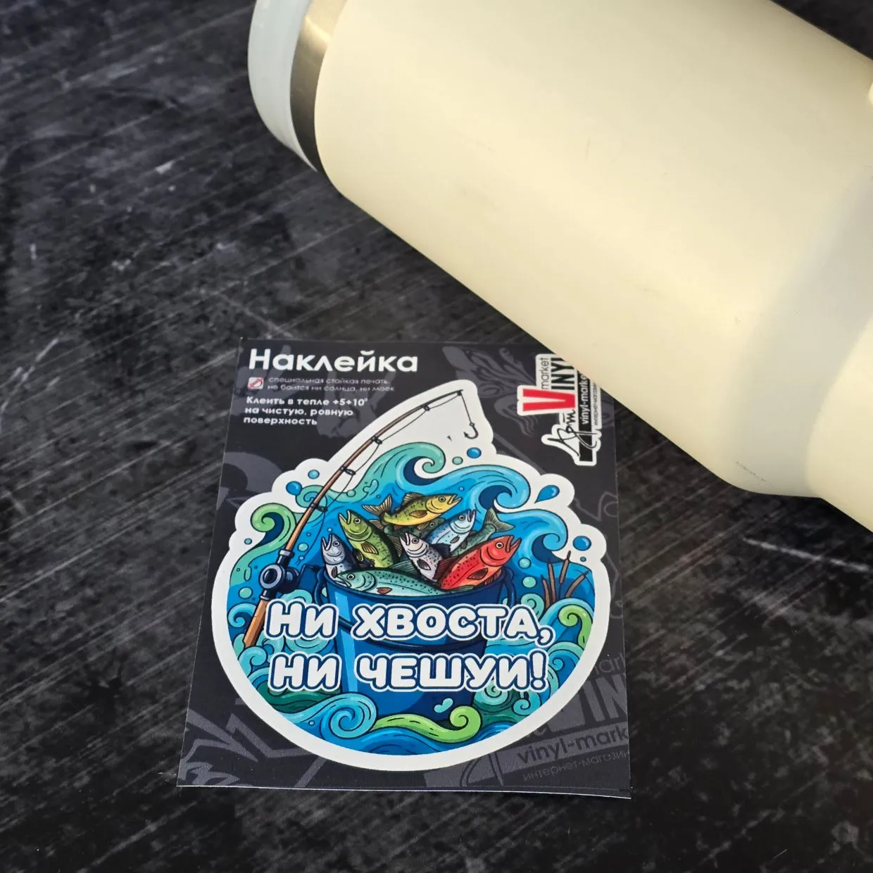 Наклейка для рыбака с фразой "Ни хвоста, ни чешуи!". Те, кто с удочкой не растается те знают, ее смымл. А для нас, кто не в теме - так желают хорошего улова. Ну как охотнику или студенту "Не пуха, не пера". Это мы делаем вид что просто так на реку идем. Может купаться. И чтобы водные жители рыболова не боялись и добычу от него не прятали. Ну так в интернете у увлеченных рыбалкой написано. Они набрехали и я тогда соврала